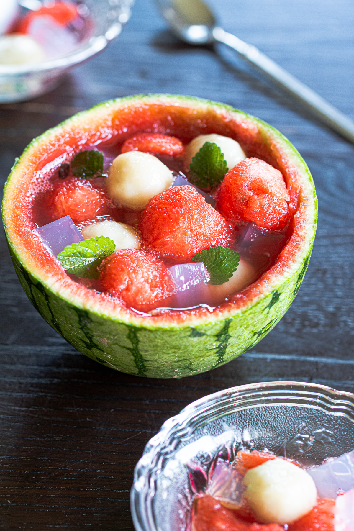- スイカを丸ごと使ったスイカのフルーツポンチに浮かべて