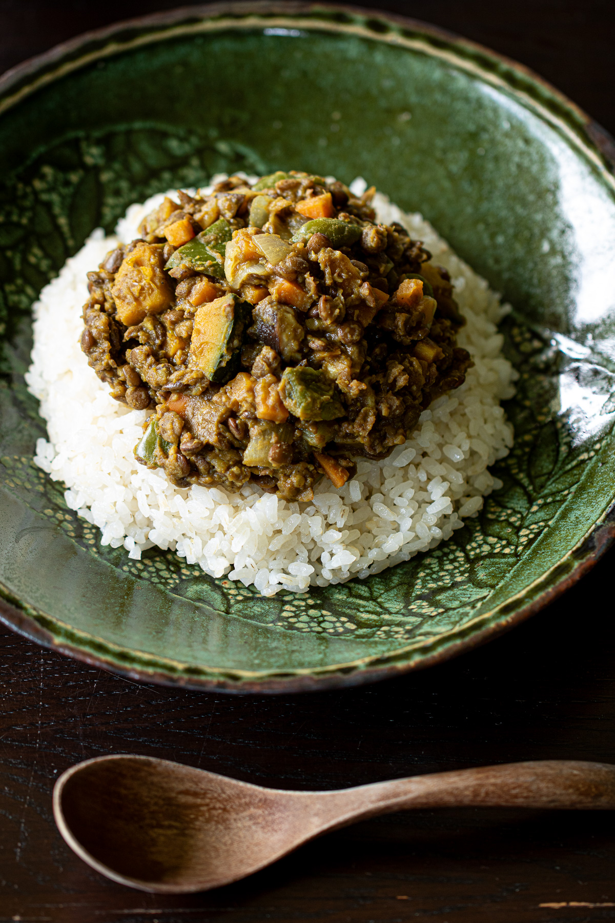 皮付きレンズ豆とたっぷりの野菜を合わせたヴィーガンドライカレーのレシピです。