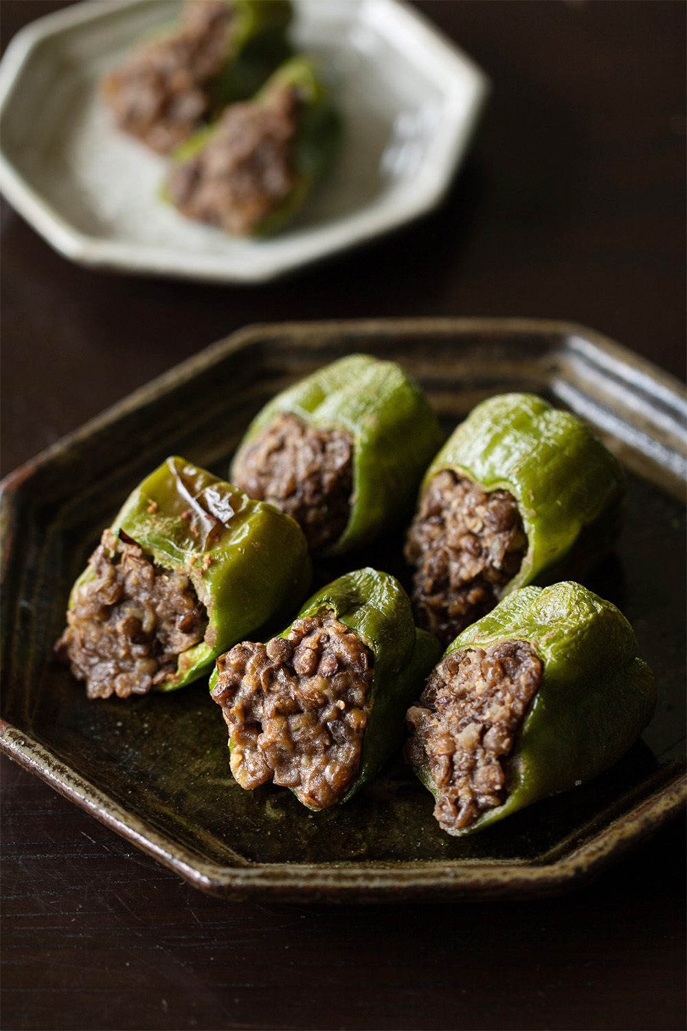 皮付きレンズ豆を使った、ピーマンの肉詰め風のレシピです。